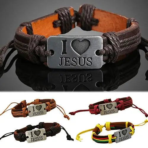 I LOVE JESUS Faux Leather Bangle Hemp Rope Chain Adjustable Bracelet