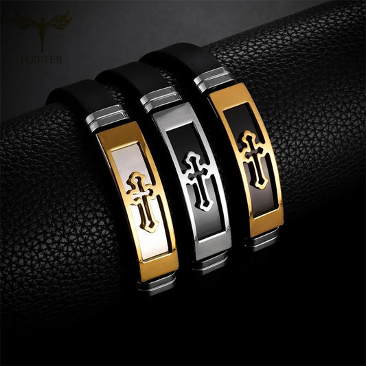 Stainless Steel Cross Bracelets Bangles Black Soft Silicone Wristband Buckle Bracelet Women Men Christianity Jewelry